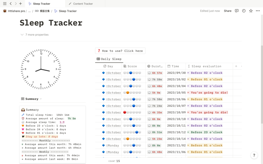 This sleep tracking template only needs to record the daily falling asleep and waking up times, and it will automatically calculate sleep time and evaluation, and can also automatically summarize and analyze weekly and monthly comparisons.